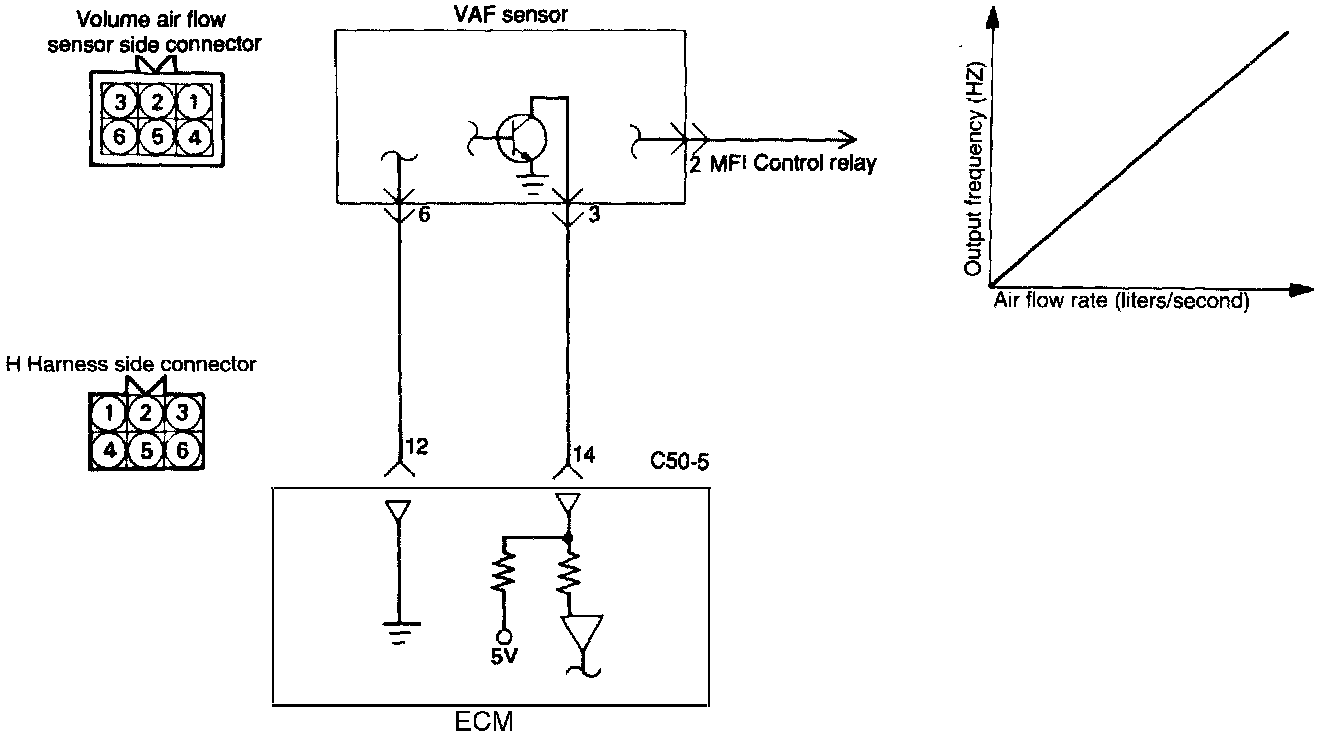 2. If the Volume Air Flow Sensor output frequency is other than 0 when the Ignition Switch is turned on (do not start the engine), Check for the faulty Volume Air Flow Sensor or Engine Control Module.