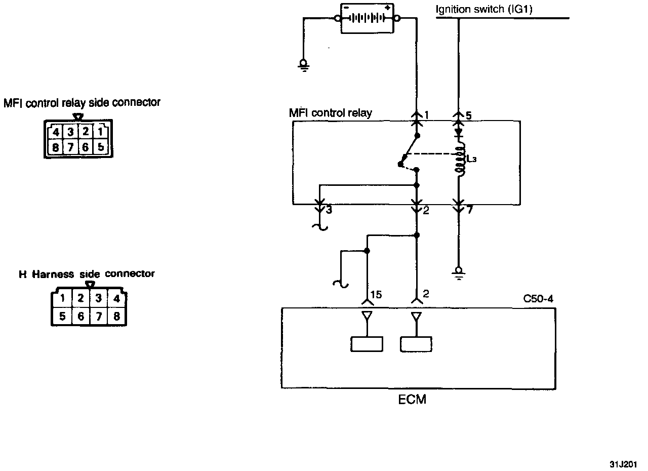 4. Check for open circuit, or short circuit to ground, between the Engine Control Module and the MFI Control Relay.