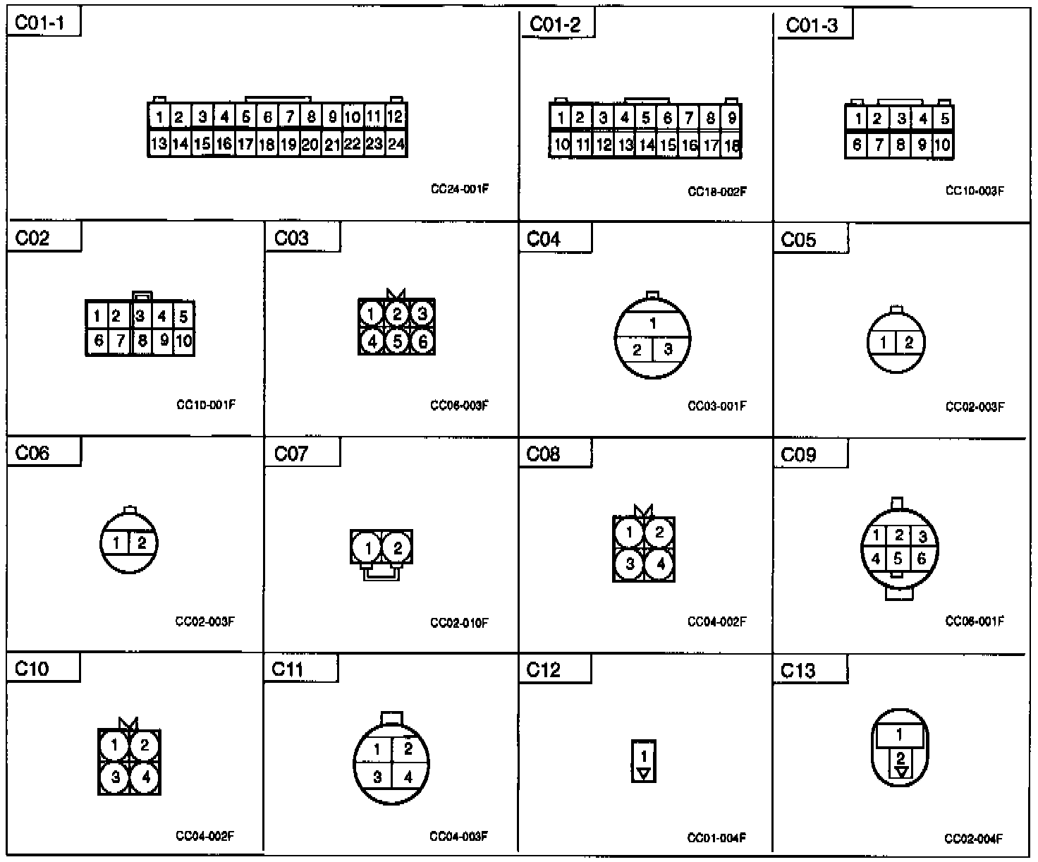 This shows the cavity or terminal locations in all the multi-pin connectors shown in the schematic diagrams. It is helpful for you to locate check points, together with the wire colors and terminal numbers in the schematic. The configuration drawings show the connector views as seen from a component after the harness connector has been disconnected. When more than one connector is connected to a component, the connectors are all shown together. Both halves of in line connectors are shown together.