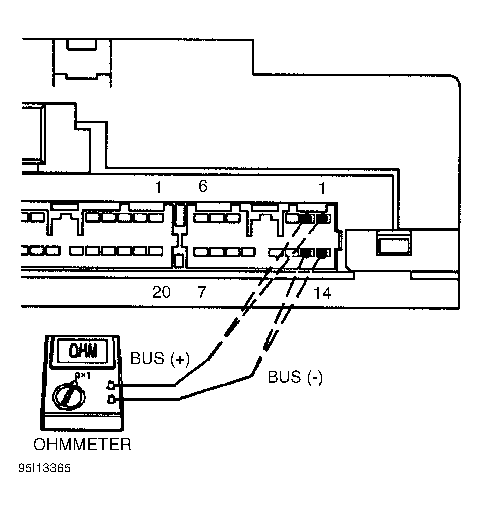 6. If resistance is 100-140 ohms in all combinations, check resistance between BUS (+) & BUS (-) circuits at engine 14-pin connector (at BCM). See Figure . See BUS (+) & BUS (-) CIRCUITS TERMINAL IDENTIFICATION table. If resistance is not 100-140 ohms in all combinations, replace BCM.