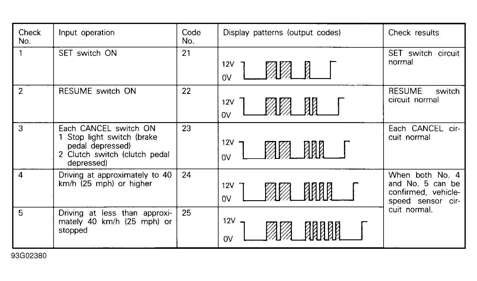 - Turn ignition on. Check items No. 1-3 on input code chart. SeeFig 3 . Start engine. Check items No. 4 and 5 on input code chart. To display results of input check, turn main cruise control switch to OFF position.