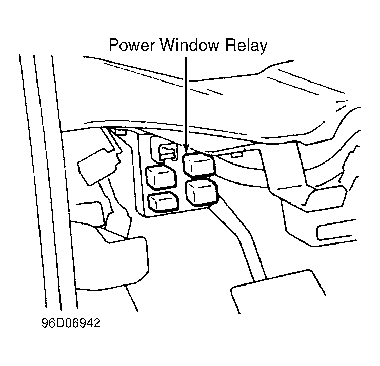 - Connect positive lead of a 12-volt battery to power window relay terminal No. 1, and negative lead of battery to terminal No. 3. Continuity should be present between terminals No. 4 and 5 with voltage applied. Replace power window relay if continuity is not as specified.