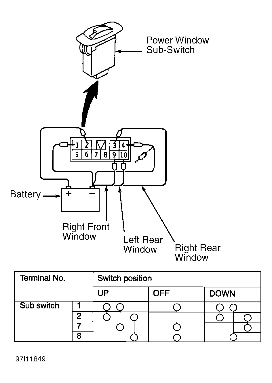 Remove power window sub-switch from trim panel. Apply battery positive voltage to switch terminal No. 2. Apply battery ground to switch terminals No. 1, 3, 4, 9 and 10. SeeFig 2 . Continuity should be present at specified terminals. SeeFig 2 . If continuity is not as specified, replace power window sub-switch.