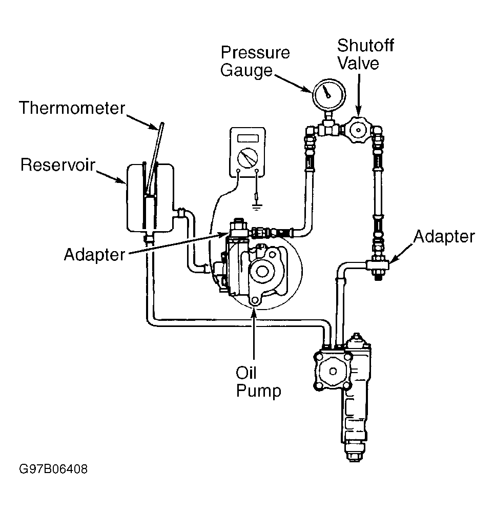 ) and shutoff valve between adapters. Open shutoff valve. Bleed steering hydraulic system. See HYDRAULIC SYSTEM BLEEDING in STEERING SYSTEM - POWER RECIRCULATING BALL