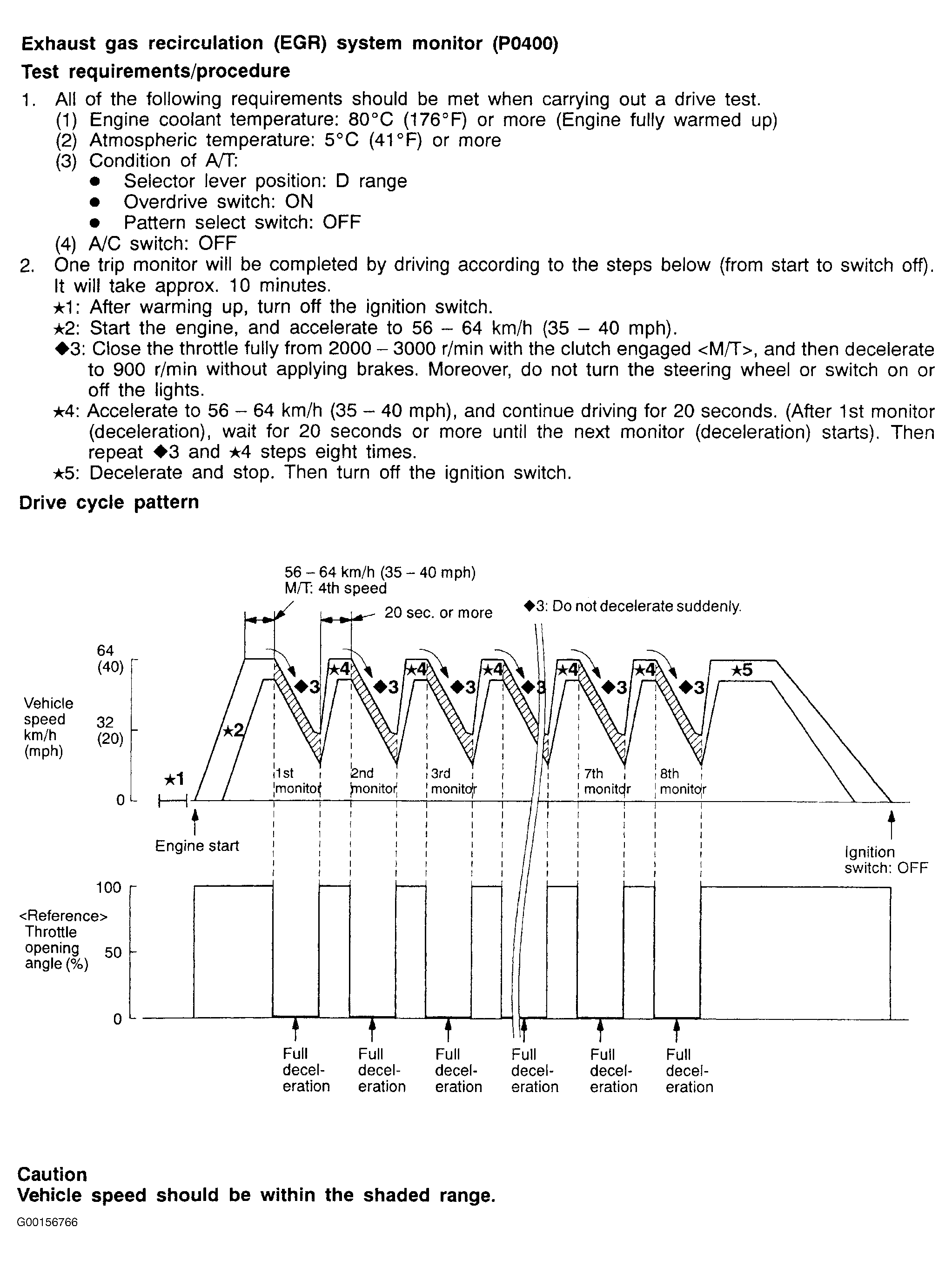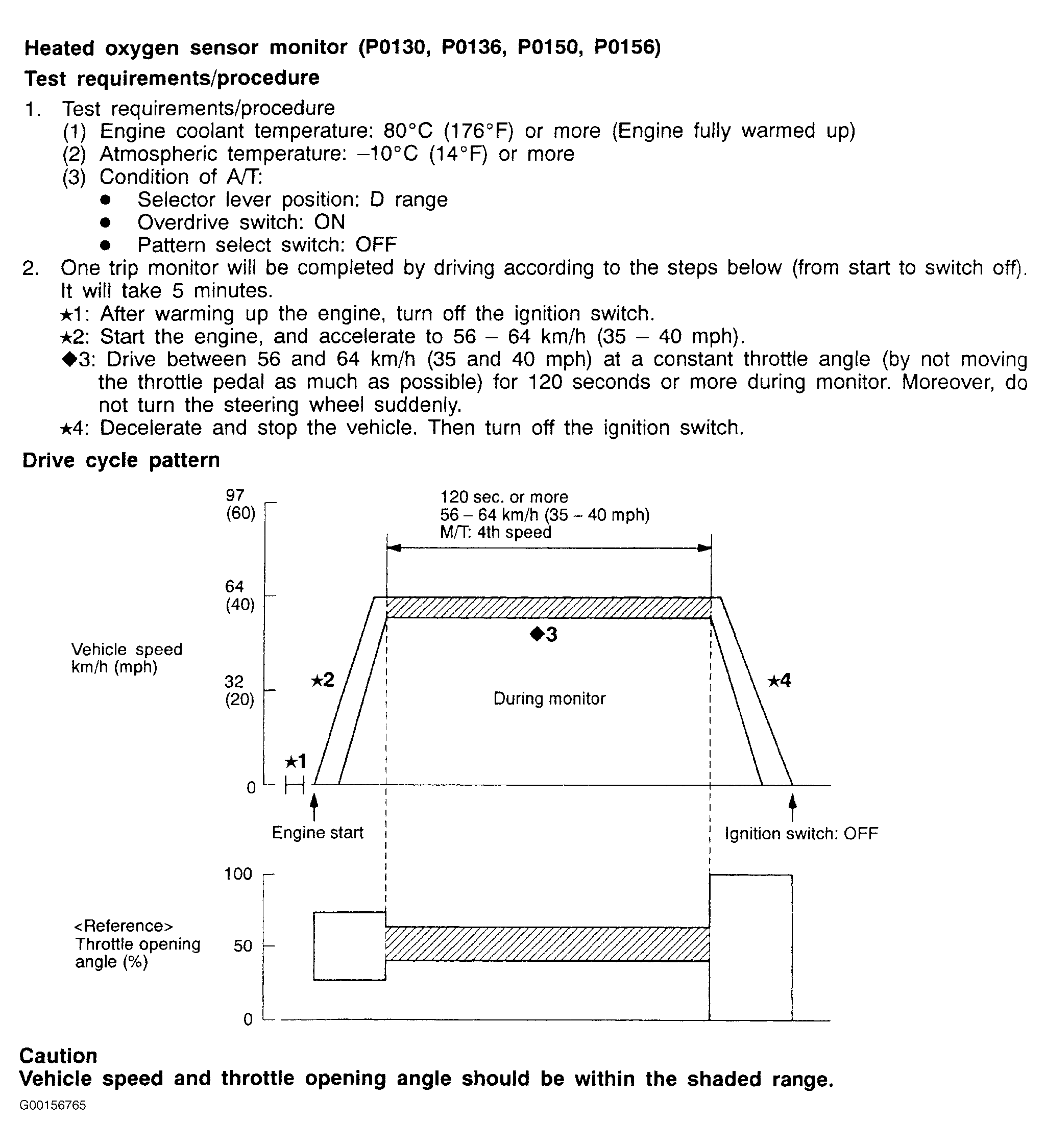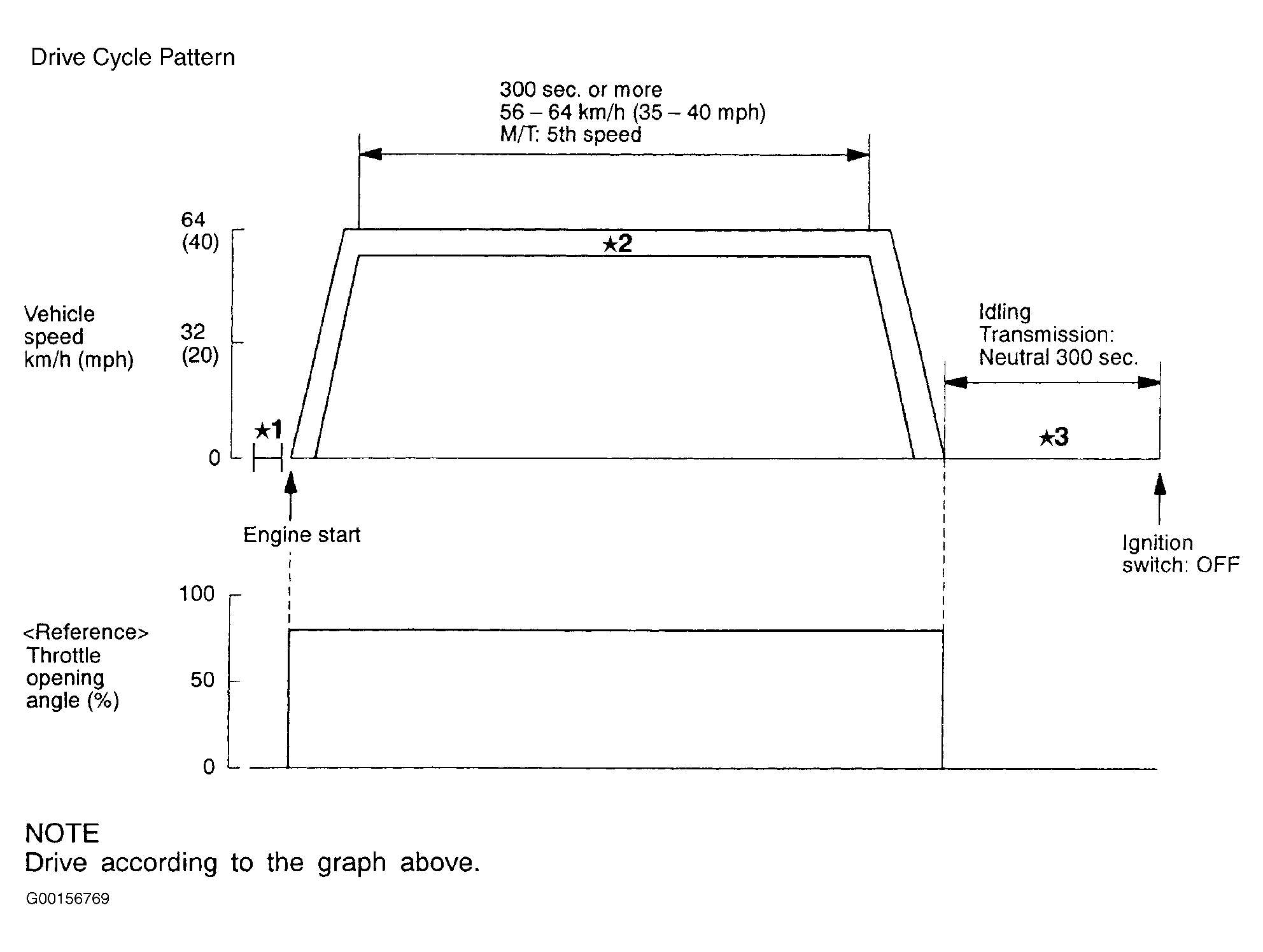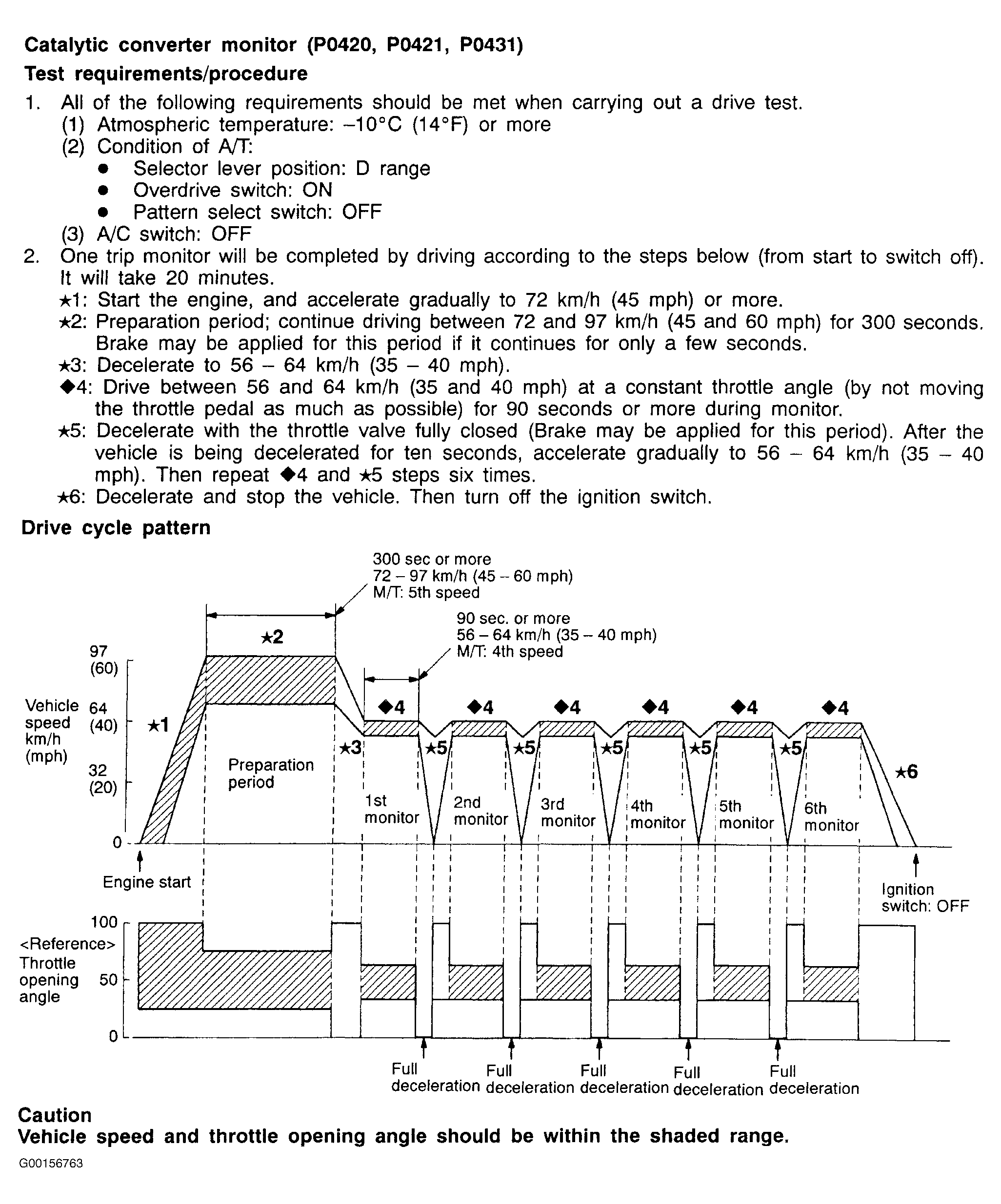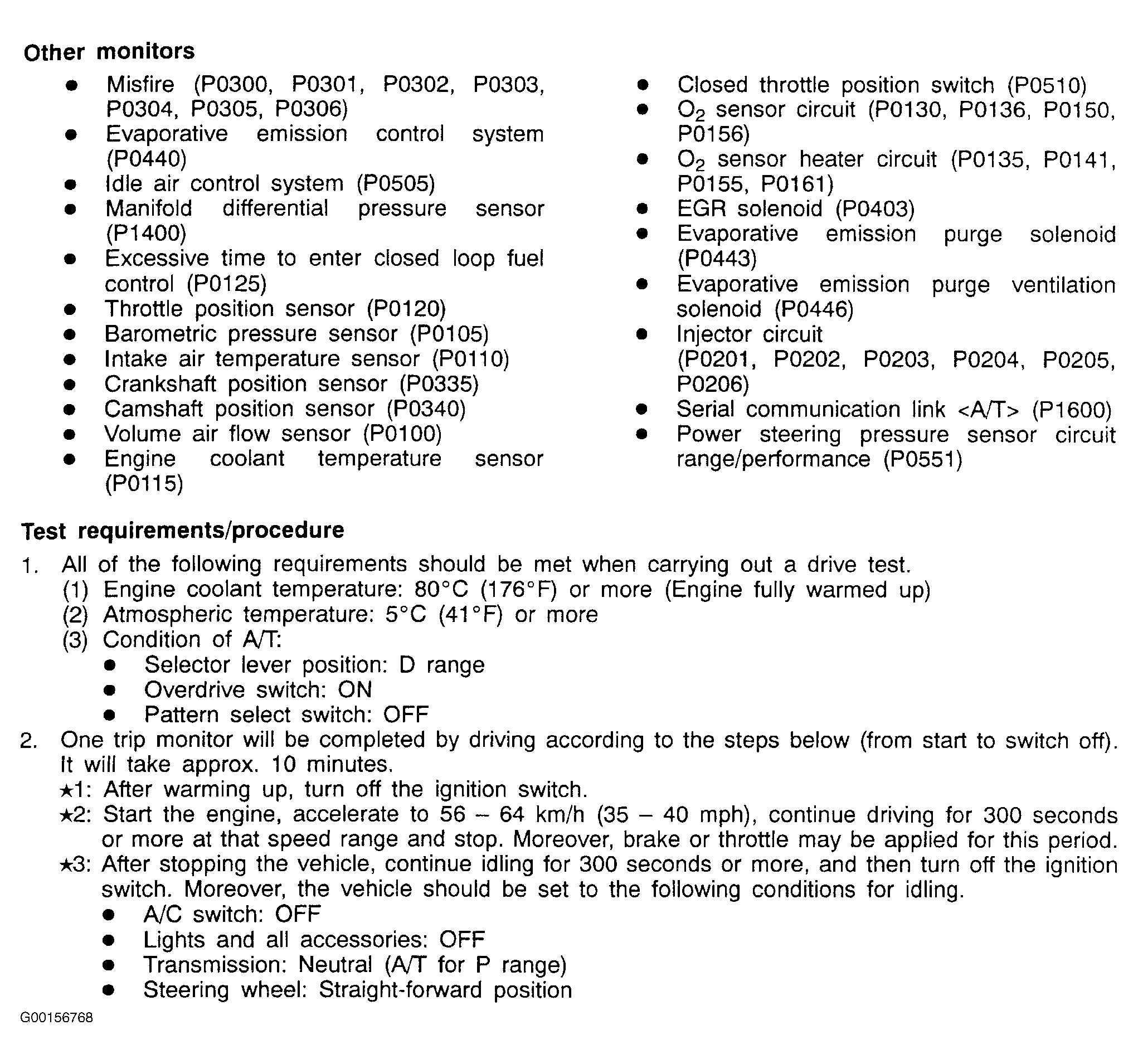 All kinds of diagnostic trouble codes can be monitored by carrying out a short drive according to the following six drive cycle pattern. In other words, doing such a drive allows to regenerate any kind of trouble which involves illuminating the Check Engine/Malfunction Indicator Lamp and to verify the repair procedures has eliminated the trouble (the Check Engine/Malfunction Indicator Lamp is no longer illuminated).