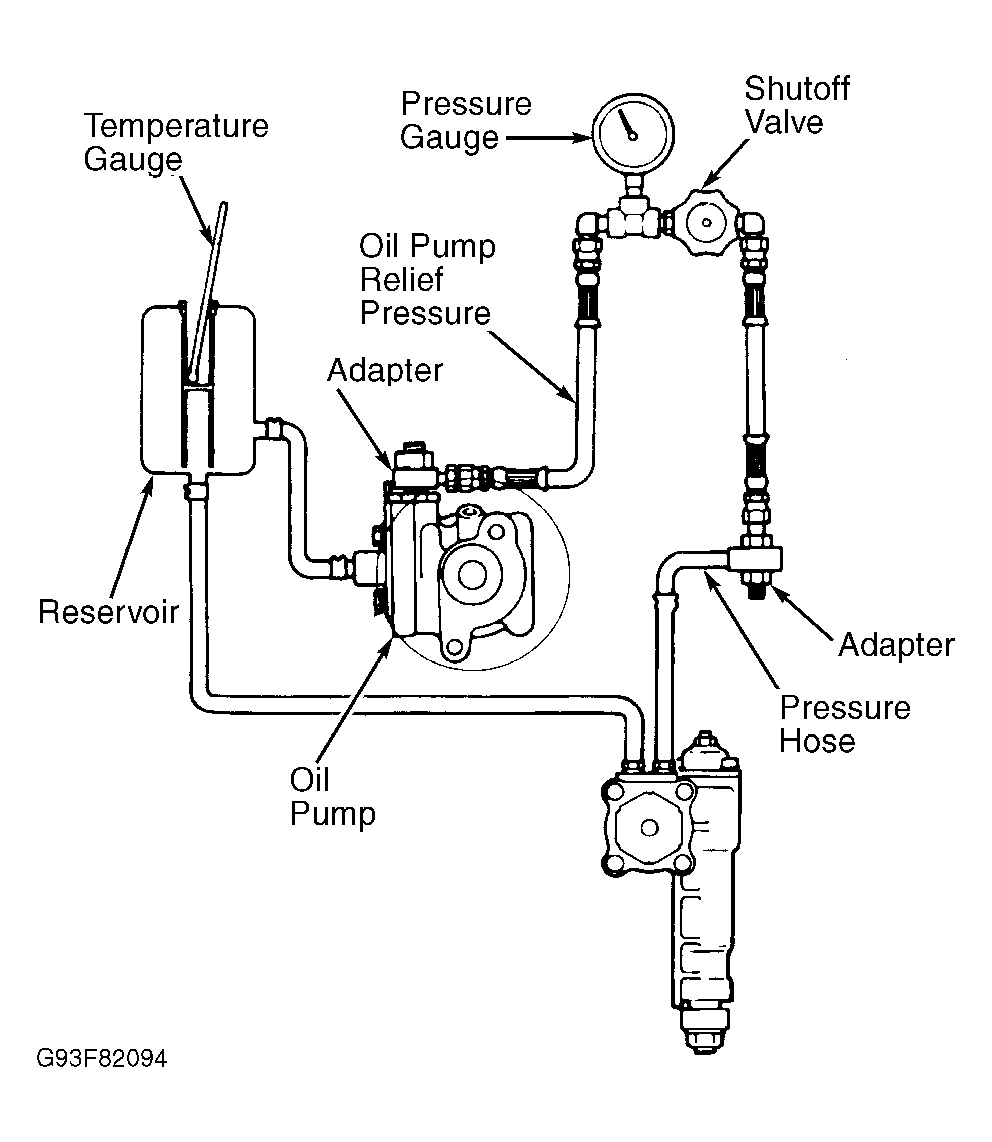 - Disconnect pressure hose from power steering pump. Attach Pressure Gauge (MB990662-01) and Adapters (MB990993-01 and MB990994-01). See Figure . Tighten fittings to 22-29 ft. lbs. (30-39 N.m).