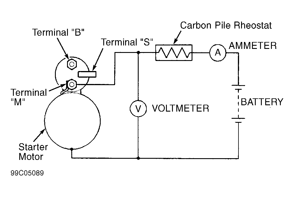 - Install starter in soft-jawed vise. Connect starter in series with a fully-charged 12-volt battery. Connect a 100-amp (130-amp on Diamante) ammeter and carbon pile rheostat in series with positive battery post and starter motor terminal. See Fig 1, Fig 2, Fig 3 or Fig 4 .