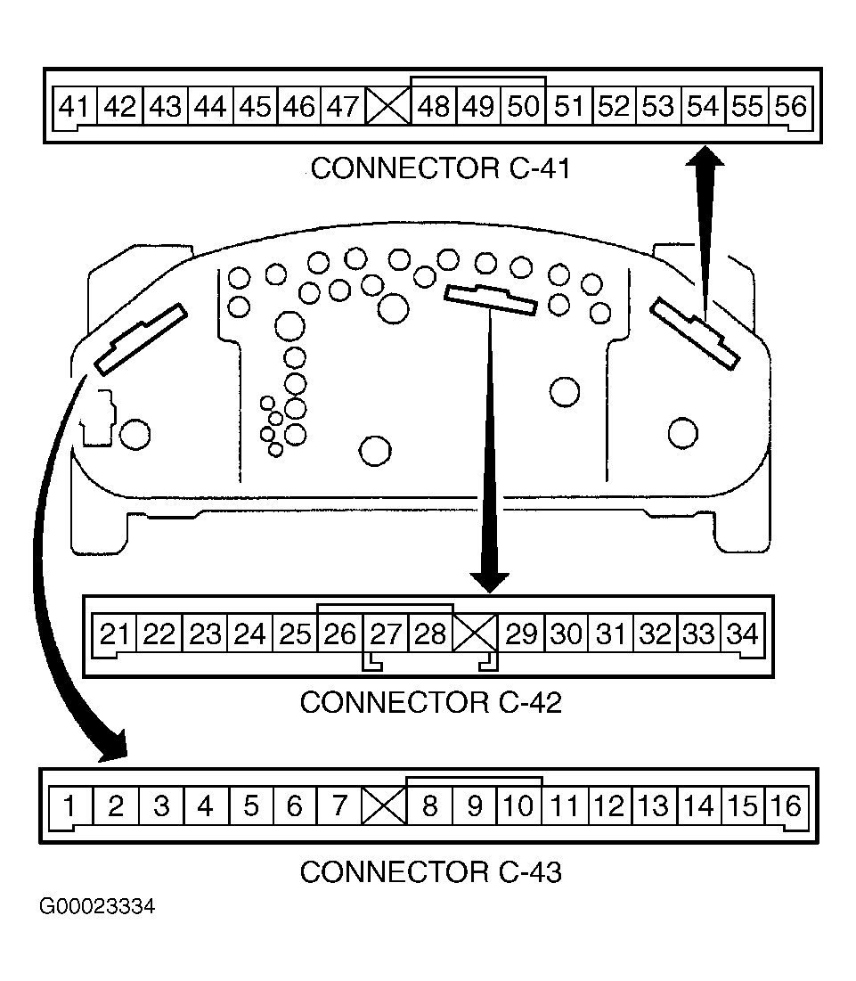 - Check foglight connectors and combination meter 16-pin connector C-43 (combination meter) for loose, damaged and corroded terminals. See Figure . Check for open or short in Red/White wire between foglight relay connector terminal No. 5 and left foglight. Check for open or short in Red/Green wire between foglight relay connector terminal No. 5 and combination meter connector C-43 terminal No. 13 and right foglight. If problem exists, repair connector or appropriate wire as necessary and retest foglight operation. If problem does not exist, replace front-ECU or ETACS-ECU and retest foglight operation.
