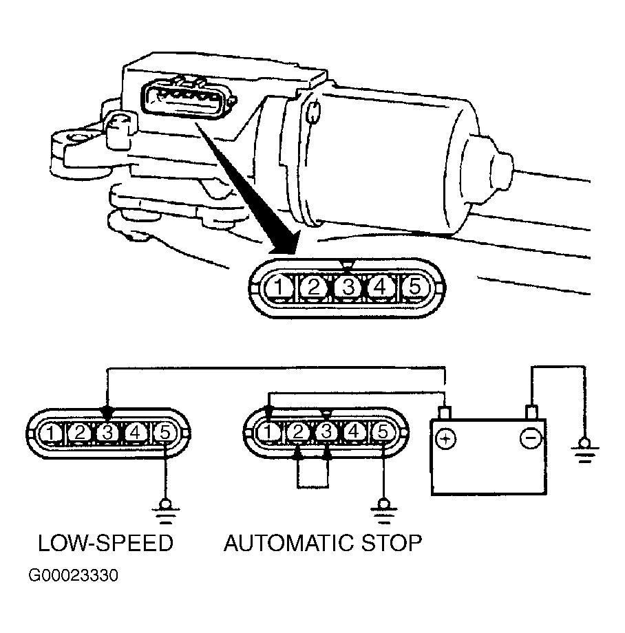 - Disconnect wiper motor 5-pin connector. Using fused jumper wires, apply battery voltage to wiper motor connector terminal No. 3 and ground wiper motor connector terminal No. 5. See Figure . Wiper should operate at low speed. Go to next step.