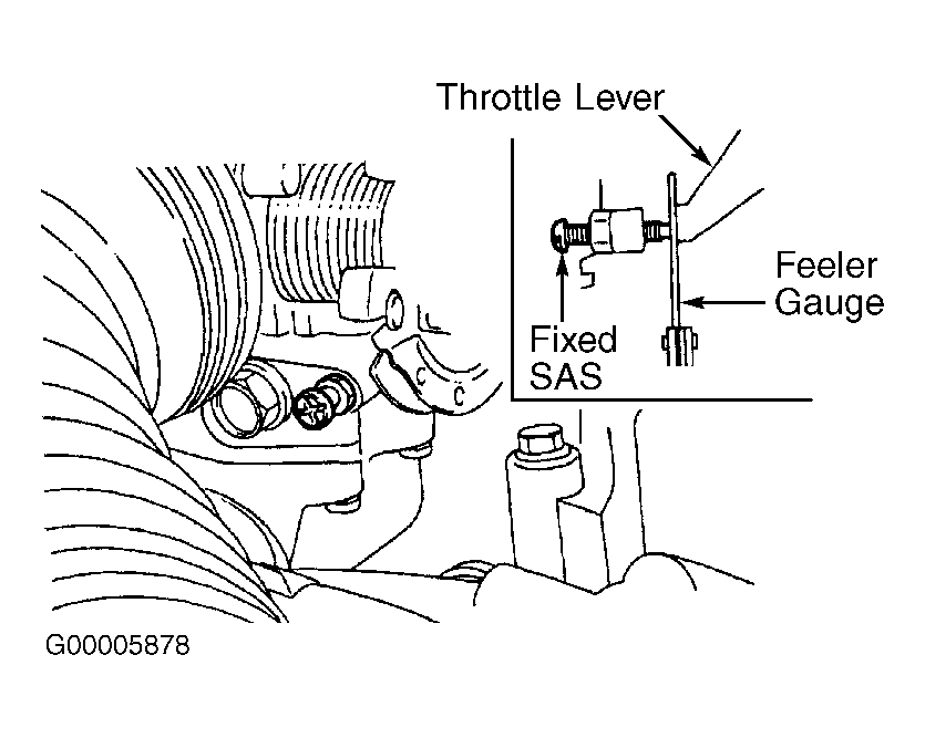2. If vehicle is 1.8L with cruise control, go to next step. If vehicle is 1.5L, or 1.8L without cruise control, insert feeler gauge with thickness of .017" (.45 mm) between fixed Speed Adjusting Screw (SAS) and throttle lever. See Figure. If using scan tool, turn ignition on and monitor closed throttle switch on/off status. If using ohmmeter, leave ignition off and monitor closed throttle switch continuity. Go to step  4.
