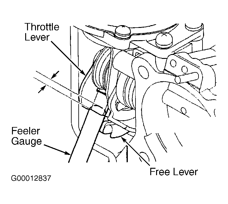 3. Insert feeler gauge with thickness of .055" (1.4 mm) about .118" (3 mm) deep between throttle levers shown in illustration. See Figure. If using scan tool, turn ignition on and monitor closed throttle switch on/off status. If using ohmmeter, leave ignition off and monitor closed throttle switch continuity. Go to next step.