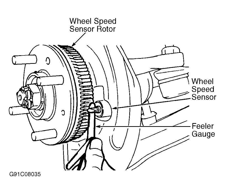 1. Raise and support vehicle. Remove tire and wheel assembly. Inspect sensor pole piece for damage. Repair if necessary. If sensor pole piece is okay, check wheel speed sensor-to-rotor gap.