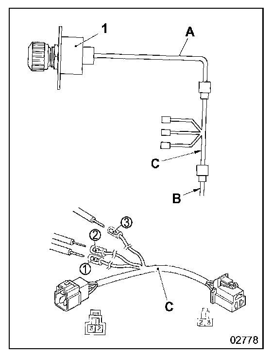 - Disconnect the harness A of the idling speed adjustment potentiometer 1 from the cab-side harness B. Then, connect an inspection harness C between harnesses A and B. (The inspection harness must be made specially for this procedure, but is not necessary with MUT II PLUS tester.)
