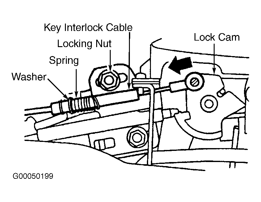 Remove front console assembly. Move selector lever to "P" position and turn ignition switch to OFF position. Loosen nut securing key interlock cable. Gently push lock cam until pin stops in direction of arrow. See Fig 1. Tighten cable nut to specification. See TORQUE SPECIFICATIONS . Install front console assembly.