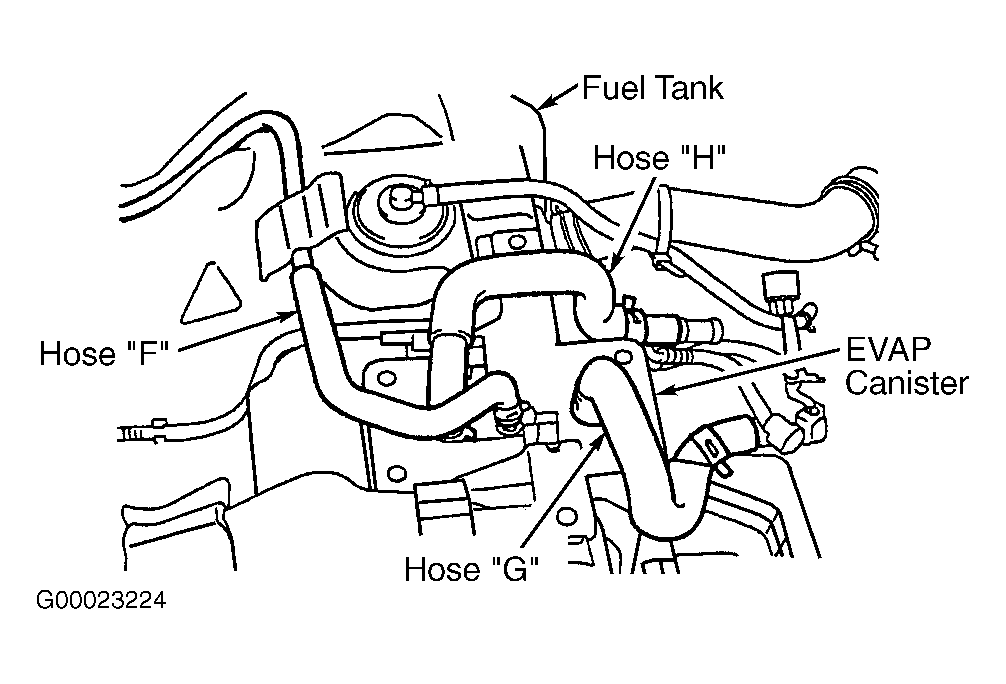- Remove fuel tank. Using hand vacuum pump, check hose "F" and EVAP canister for clogging. See Figure . Replace hose "F" or EVAP canister as necessary, install fuel tank, then go to step 33 .
