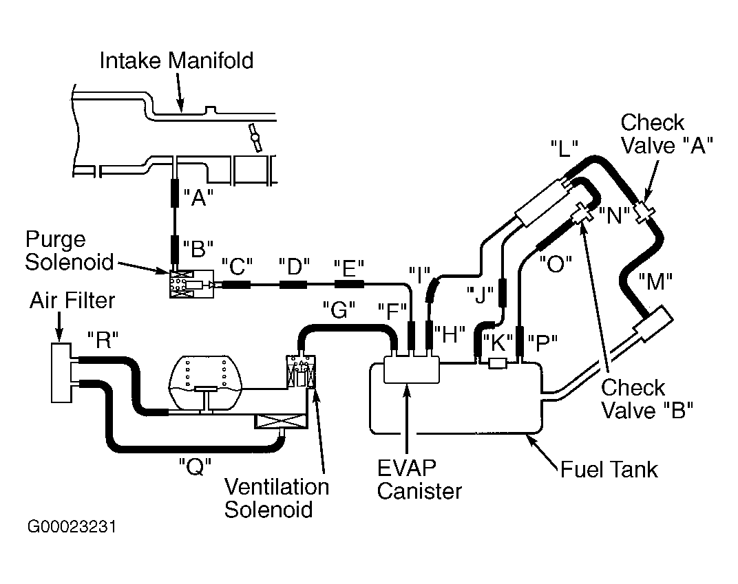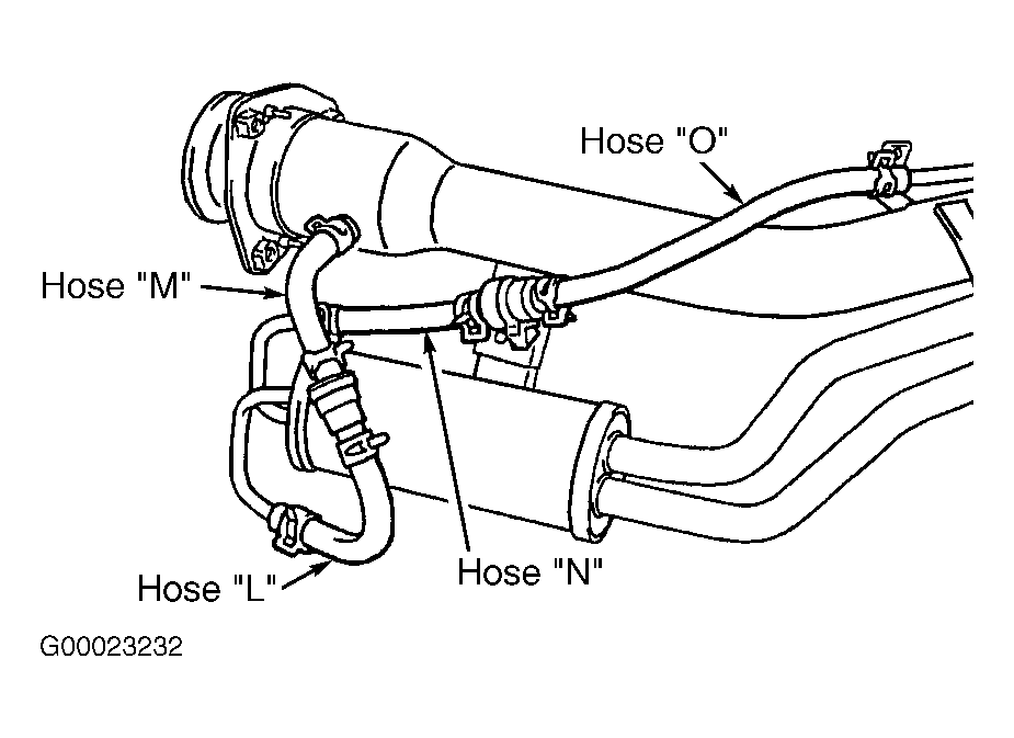 - Remove fuel filler neck assembly. Using hand vacuum pump, check hoses "I", "L", "M", "N" and "O" for leaks. See Figure and Figure . If leak exists, replace appropriate hose(s), install fuel filler neck, then go to step 31 . If leak does not exist, go to next step.