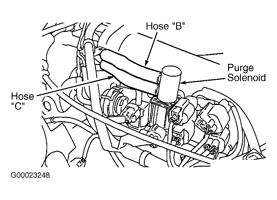 - Disconnect hose "C" from purge solenoid. See Figure . Turn ignition on. Using scan tool, select actuator test item No. 8 (purge solenoid) and turn on (open) purge solenoid. Vacuum should return to atmospheric pressure. If purge solenoid operates and vacuum returns to atmospheric pressure, go to step 5 . If purge solenoid operates and vacuum does not return to atmospheric pressure, go to next step. If purge solenoid does not operate, see DTC P0443: EVAPORATIVE EMISSION (EVAP) SYSTEM PURGE SOLENOID CIRCUIT MALFUNCTION .