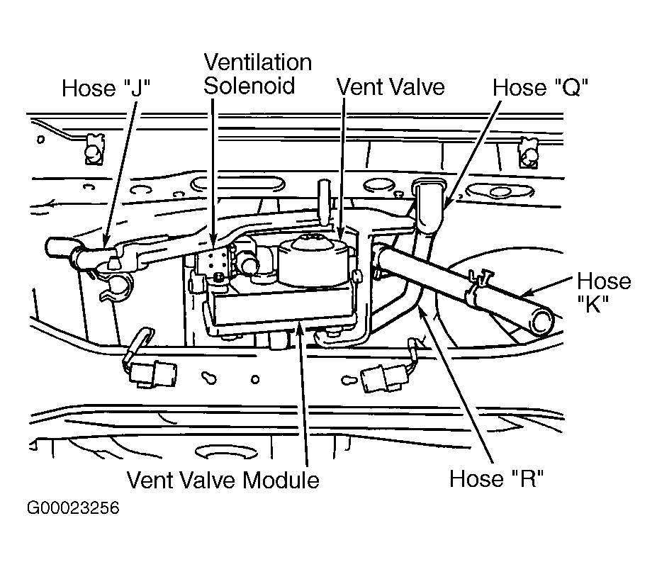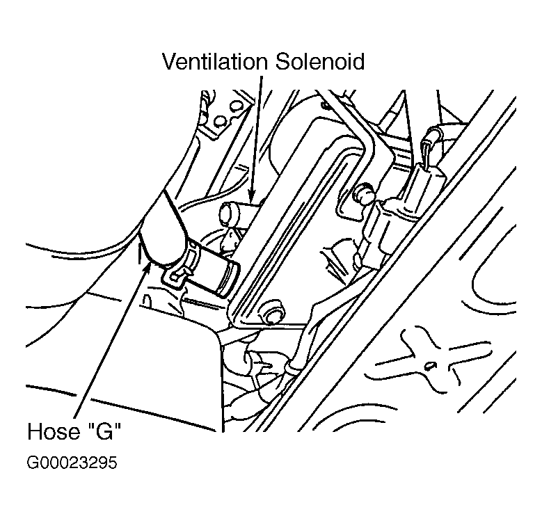 - Connect hoses "A", "B", and "C". Remove vent valve module bracket mounting bolts. Disconnect hose "G" from ventilation solenoid. Connect hand vacuum pump to ventilation solenoid. See Figure