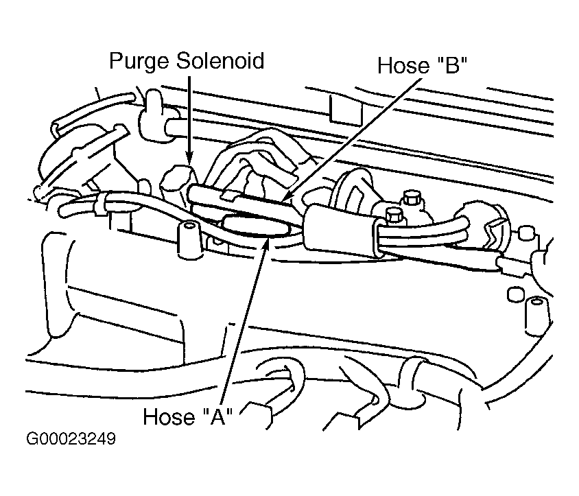 - Disconnect hoses "A" and "B" from purge solenoid. See Figure and Figure . Connect hand vacuum pump to purge solenoid port from which hose "A" was disconnected. Using hand vacuum pump, apply vacuum. Vacuum should hold. Using scan tool, select actuator test item No. 8 (purge solenoid) and turn on (open) purge solenoid. Vacuum should leak. If purge solenoid does not operate, diagnose purge solenoid circuit problem. See DTC P0443: EVAPORATIVE EMISSION (EVAP) SYSTEM PURGE CONTROL MALFUNCTION . If purge solenoid operates and vacuum leaks as specified, go to next step. If purge solenoid operates and vacuum does not leak as specified, replace purge solenoid, then go to step 26.