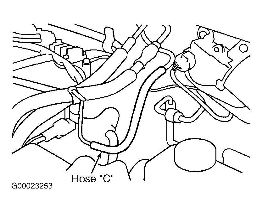 - Turn ignition off. Using hand vacuum pump, check hoses "B" through "D" for clogging. See Figure and Figure . If clogging exists, replace appropriate hose, then go to step 26. If clogging does not exist, go to next step.