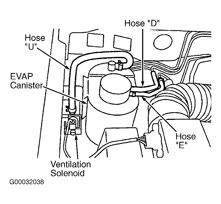 - Disconnect hose "U" at ventilation solenoid side. See Figure. Connect hand vacuum pump to ventilation solenoid port from which hose "U" was disconnected. Using hand vacuum pump, apply vacuum. Vacuum should leak. Turn ignition on. Using scan tool, select actuator test item No. 29 (ventilation solenoid) and turn ventilation solenoid on (closed). Using hand vacuum pump, apply vacuum. Vacuum should hold. If ventilation solenoid operates and holds vacuum as specified, go to next step. If ventilation solenoid operates but does not hold vacuum as specified, replace ventilation solenoid, then go to step 26. If ventilation solenoid does not operate properly, check ventilation solenoid circuit. See DTC P0446: EVAPORATIVE EMISSION (EVAP) SYSTEM VENT CONTROL MALFUNCTION .