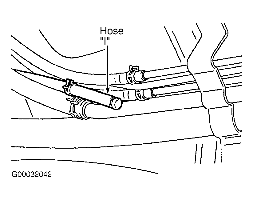 - Remove fuel filler neck assembly. Using hand vacuum pump, check hoses "H" and "I" for clogging. See Figure and Figure . If clogging exists, replace appropriate hose and install fuel filler neck assembly, then go to step 28. If clogging does not exist, go to next step.
