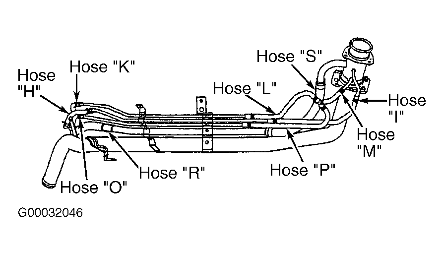 - Remove fuel filler neck assembly. Using hand vacuum pump, check hoses "I", "K", "L", "M", "O", "P", "R", and "S" for leaks. See Figure. If leak is indicated, replace appropriate hose, install fuel filler neck assembly, then go to step 26. If leak is not indicated, go to next step.