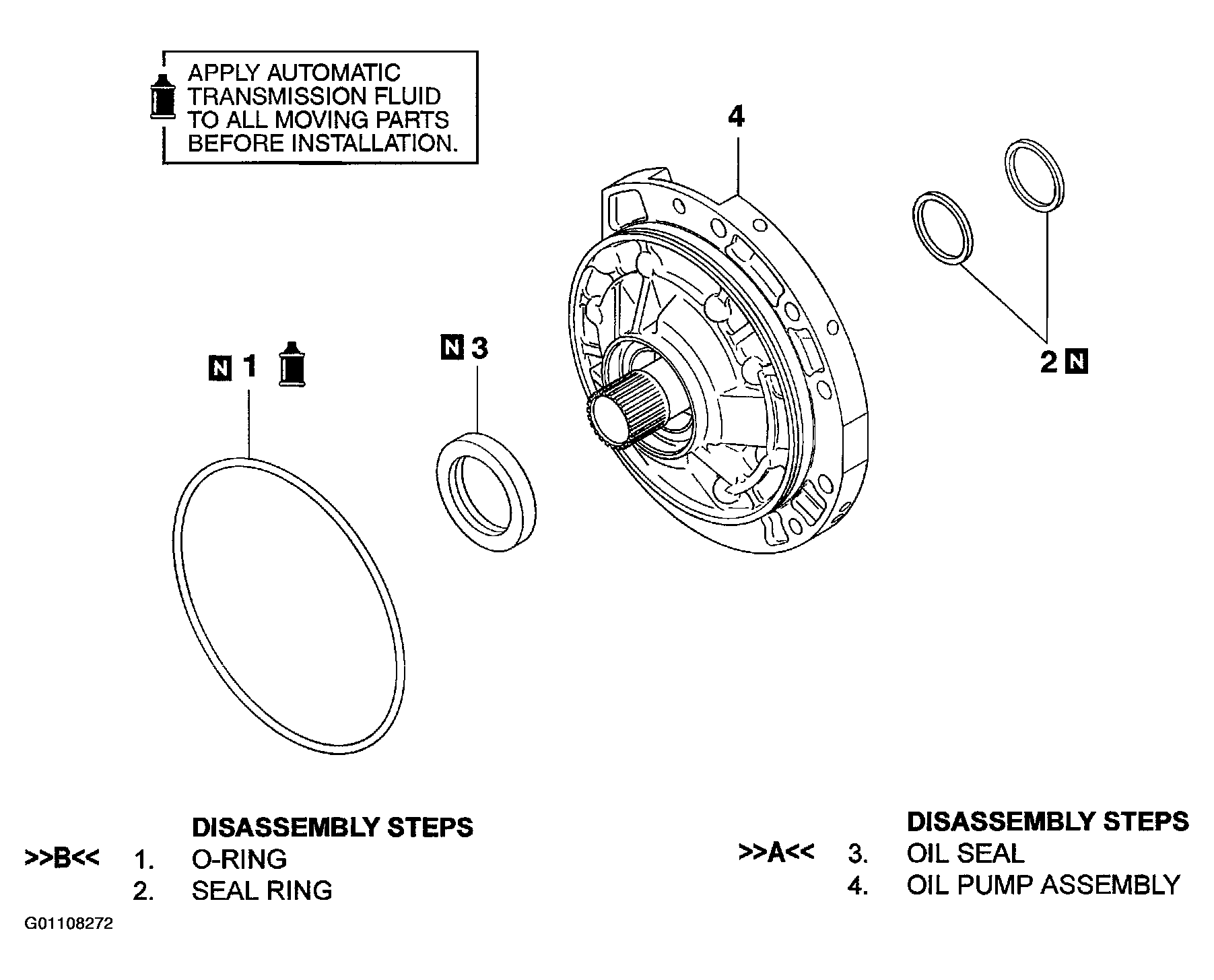 For oil pump disassembly procedures, follow numbered steps in illustration. See Fig 1. For oil pump assembly procedures, follow numbers steps in illustration in reverse order. Letters with arrows pointing towards letter refer to service points to be observed while performing that step of the assembly procedure. See ASSEMBLY SERVICE POINTS .
