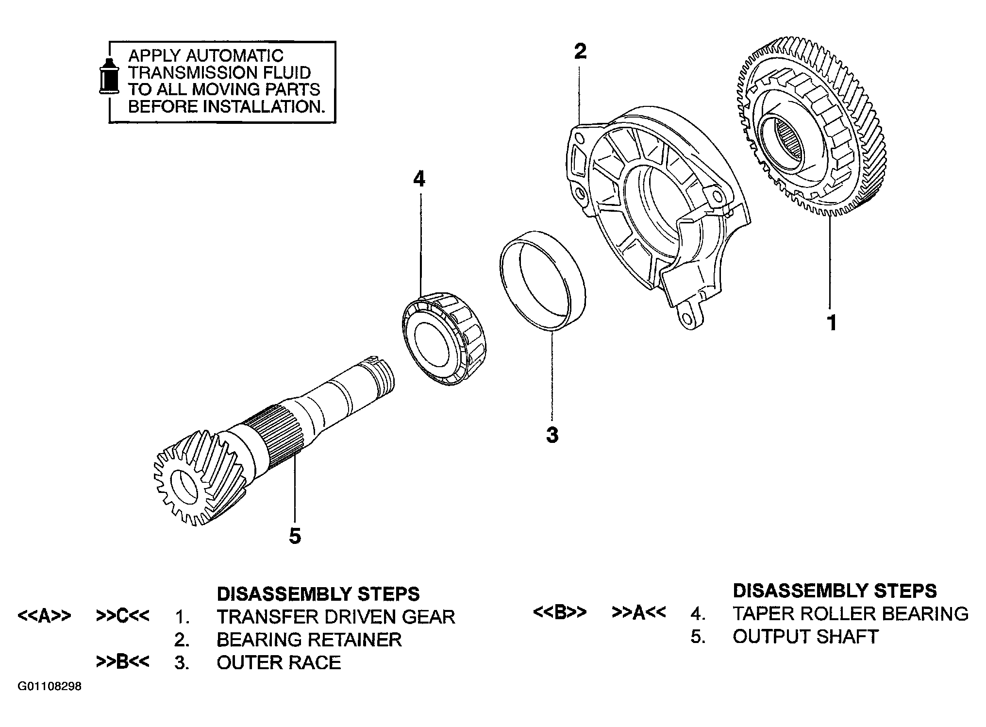 For output shaft disassembly procedures, follow numbered steps in illustration. See Fig 1. For output shaft assembly procedures, follow numbers steps in illustration in reverse order. Letters in illustration refer to service point to observe while disassembling and assembling output shaft. Letters with arrows pointing away from letter refer to service points to be observed while performing that step of the disassembly procedure. See DISASSEMBLY SERVICE POINTS . Letters with arrows pointing towards letter refer to service points to be observed while performing that step of the assembly procedure. See ASSEMBLY SERVICE POINTS .