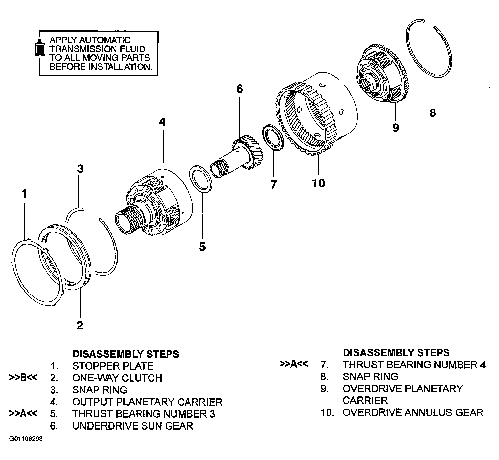 For planetary gear disassembly procedures, follow numbered steps in illustration. See Fig 1. For planetary gear assembly procedures, follow numbers steps in illustration in reverse order. Letters in illustration refer to service point to observe while disassembling and assembling planetary gear. Letters with arrows pointing towards letter refer to service points to be observed while performing that step of the assembly procedure. See ASSEMBLY SERVICE POINTS .