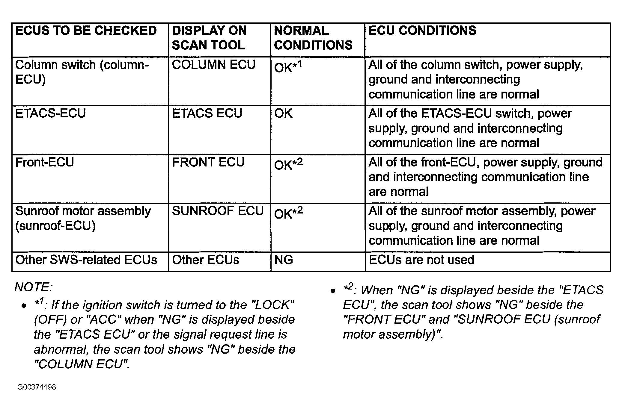 - The following ECUs can be checked by using the scan tool and the SWS monitor kit. See Fig 1.NOTE: The "ECU CHECK" function checks a communication status of ECUs "NG" does not always mean ECU malfunction. If a malfunction is found by the "ECU CHECK", proceed to SYSTEM TESTS .