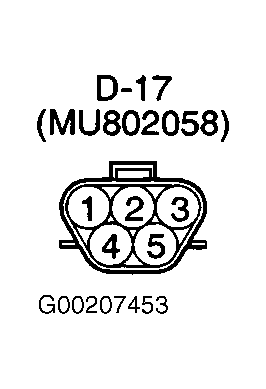 2. Disconnect the fuel temperature sensor connector D-17. See Figure. Measure the resistance between terminal 1 and 3 of the fuel temperature sensor. If the resistance is at the standard value, go to next step. If the resistance is off, replace the fuel temperature sensor and go to step  5.