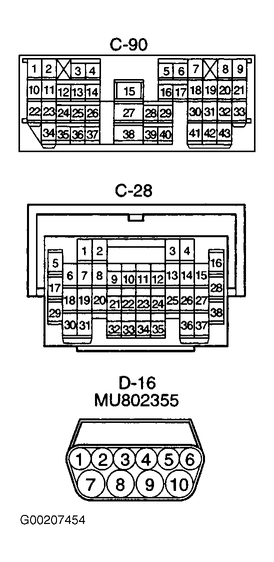 4. Check for short circuit to ground between fuel temperature sensor connector D-17 and ECM connector C-60 (M/T) or PCM connector C-54 (A/T). See Figure, Figure or Figure . Check harness after checking intermediate connector C-90 and C-28. See Figure. If intermediate connector is damaged, repair or replace it and go to next step. If the harness wire is in good condition, replace the ECM or PCM and go to next step. If the harness wire is damaged, repair it and go to next step.