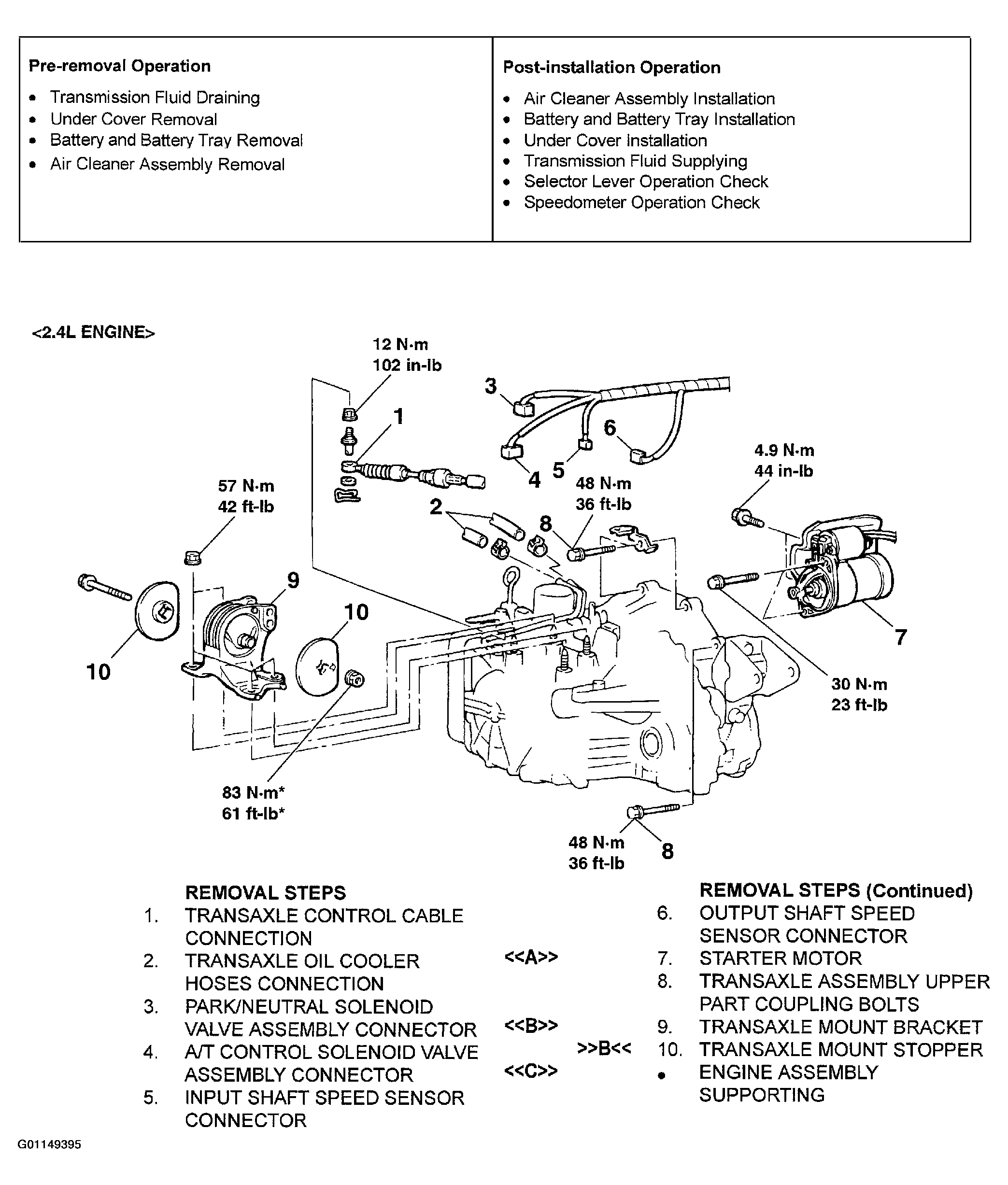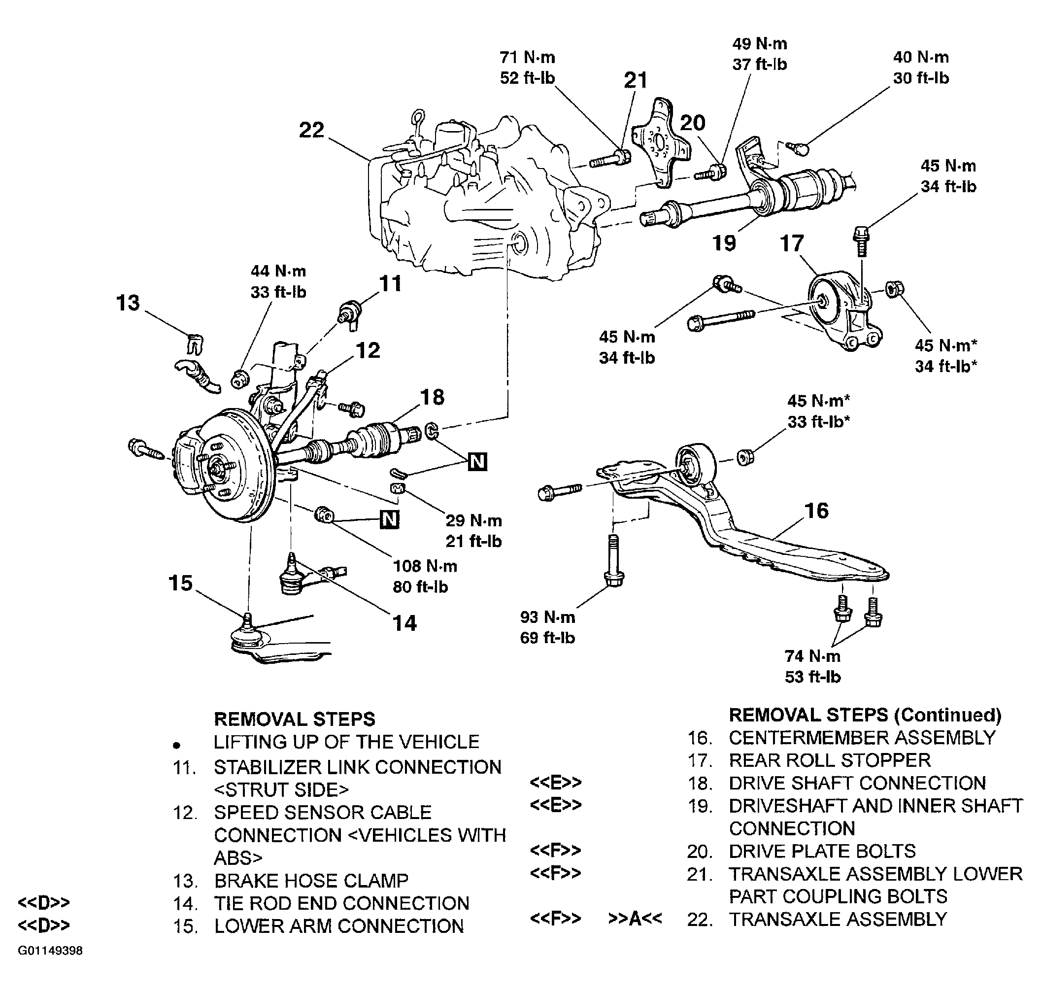 For transaxle assembly removal procedures, follow numbered steps in illustration. See Fig 1 -Fig 4 . For transaxle assembly installation procedures, follow numbers steps in illustration in reverse order. Letters in illustration refer to service point to observe while removing and installing transaxle assembly. Letters with arrows pointing away from letter refer to service points to be observed while performing that step of the removal procedure. See REMOVAL SERVICE POINTS . Letters with arrows pointing towards letter refer to service points to be observed while performing that step of the assembly procedure. See INSTALLATION SERVICE POINTS .