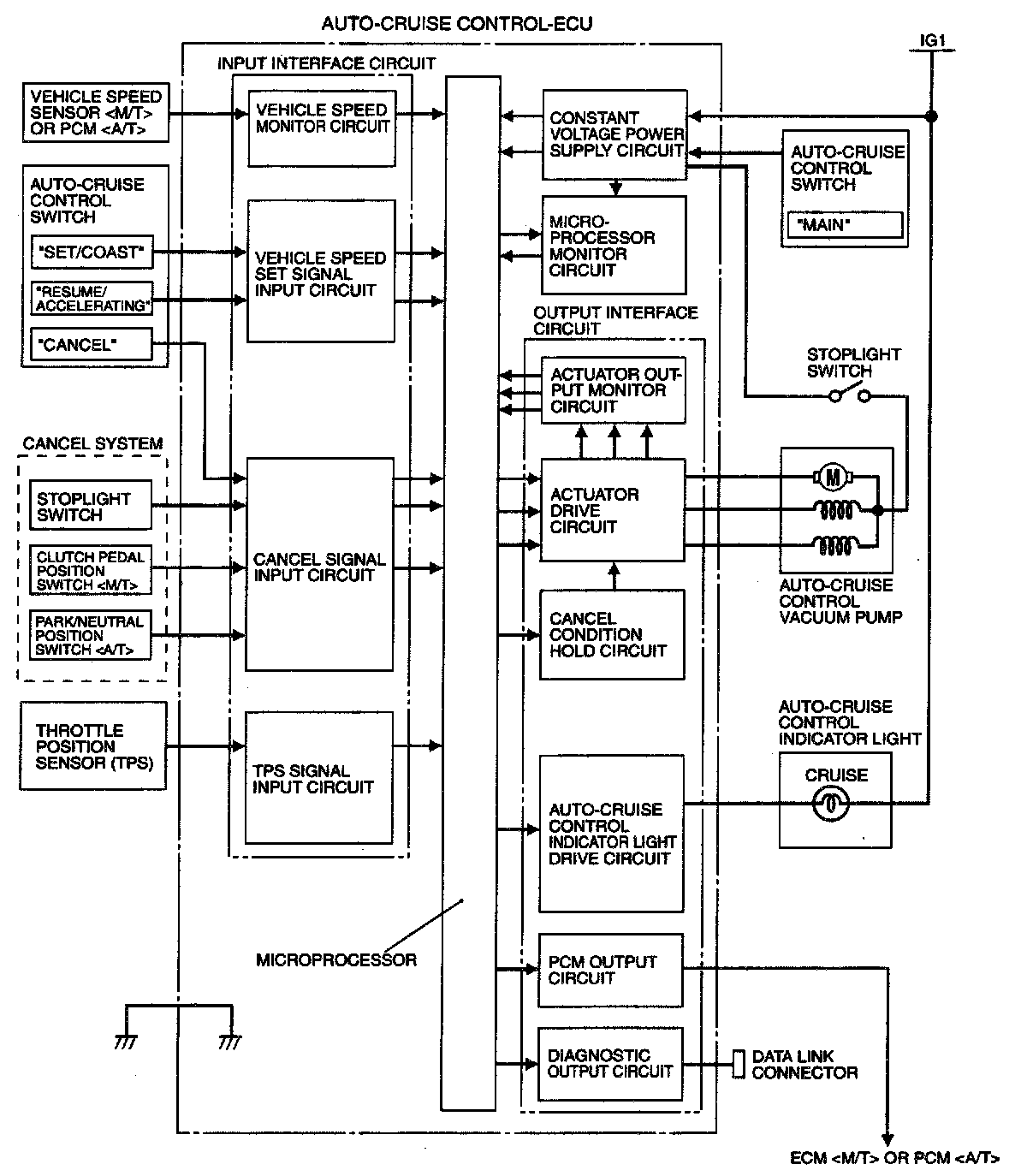 AUTO-CRUISE CONTROL-ECUThe auto-cruise control-ECU consists of the input interface circuit, microprocessor, constant voltage power supply circuit, microprocessor monitor circuit and output interface circuit. Vehicle signals from the vehicle speed sensor