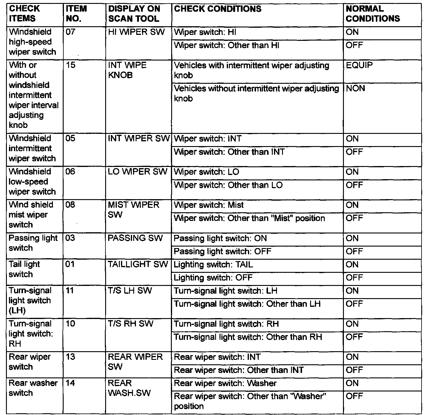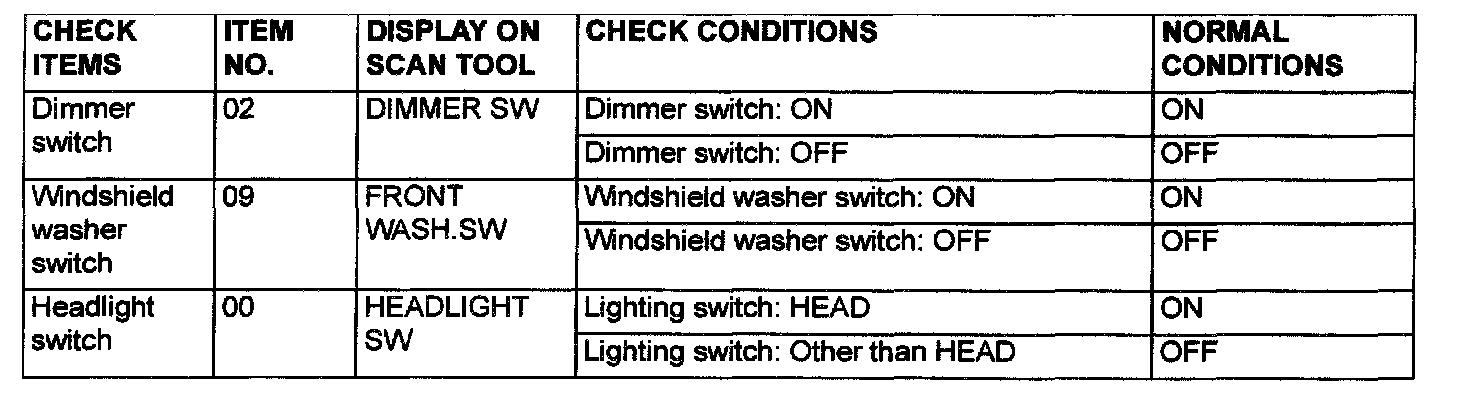 SERVICE DATA CHECK1. Use the scan tool and the SWS monitor kit to check "Service Data." This "Service Data" check is applicable for signals, which are transmitted and received through the SWS communication line. For input signals, which are not compatible with the SWS monitor kit, refer to the Pulse Check procedure (by using the scan tool or voltmeter).