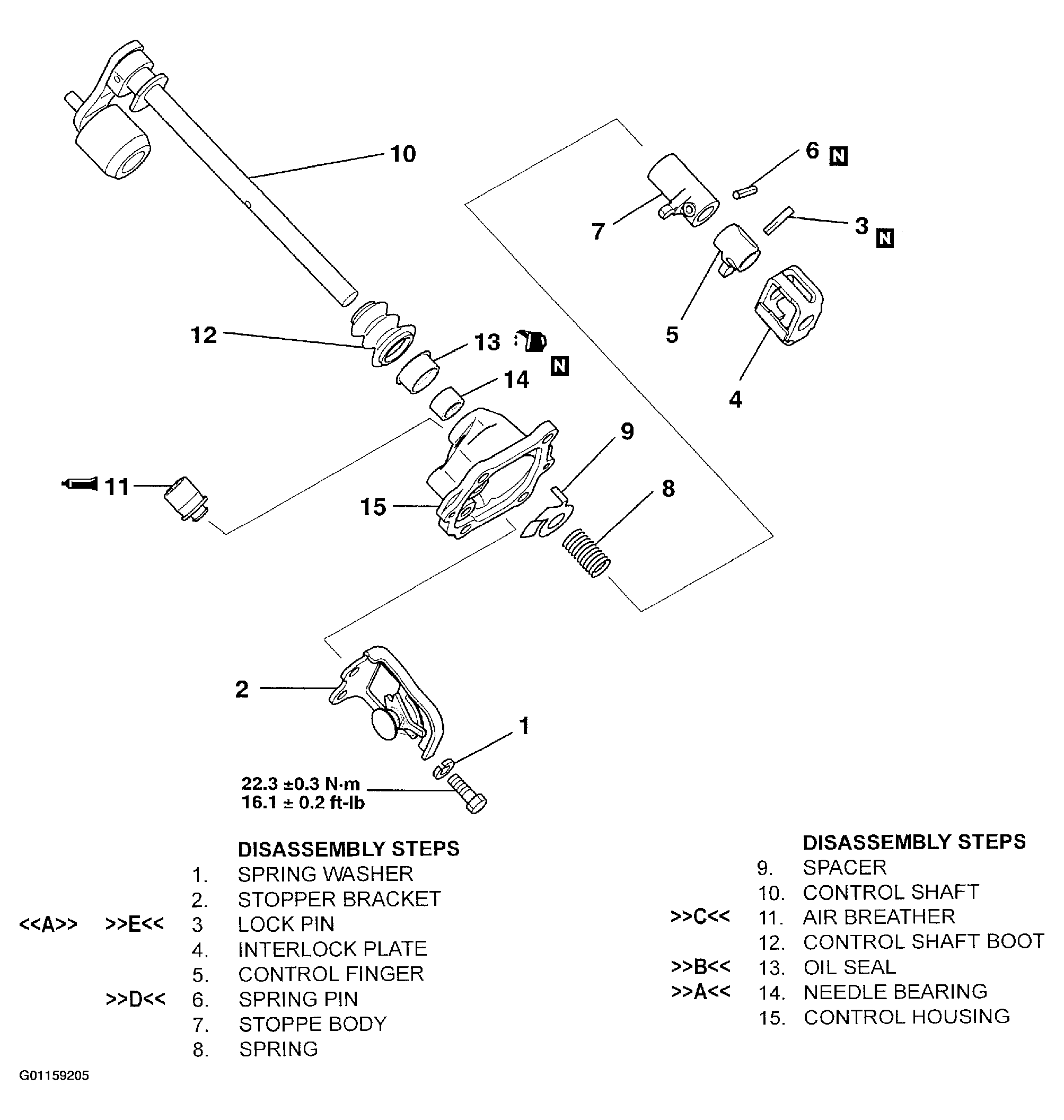 For control housing disassembly procedures, follow numbered steps in illustration. See Fig 1. For drive shaft assembly procedures, follow numbered steps in illustration in reverse order. Letters in illustration refer to service point to observe while disassembling and assembling drive shaft. Letters with arrows pointing away from letter refer to service points to be observed while performing that step of the disassembly procedure. See DISASSEMBLY SERVICE POINT . Letters with arrows pointing towards letter refer to service points to be observed while performing that step of the assembly procedure. See ASSEMBLY SERVICE POINTS .
