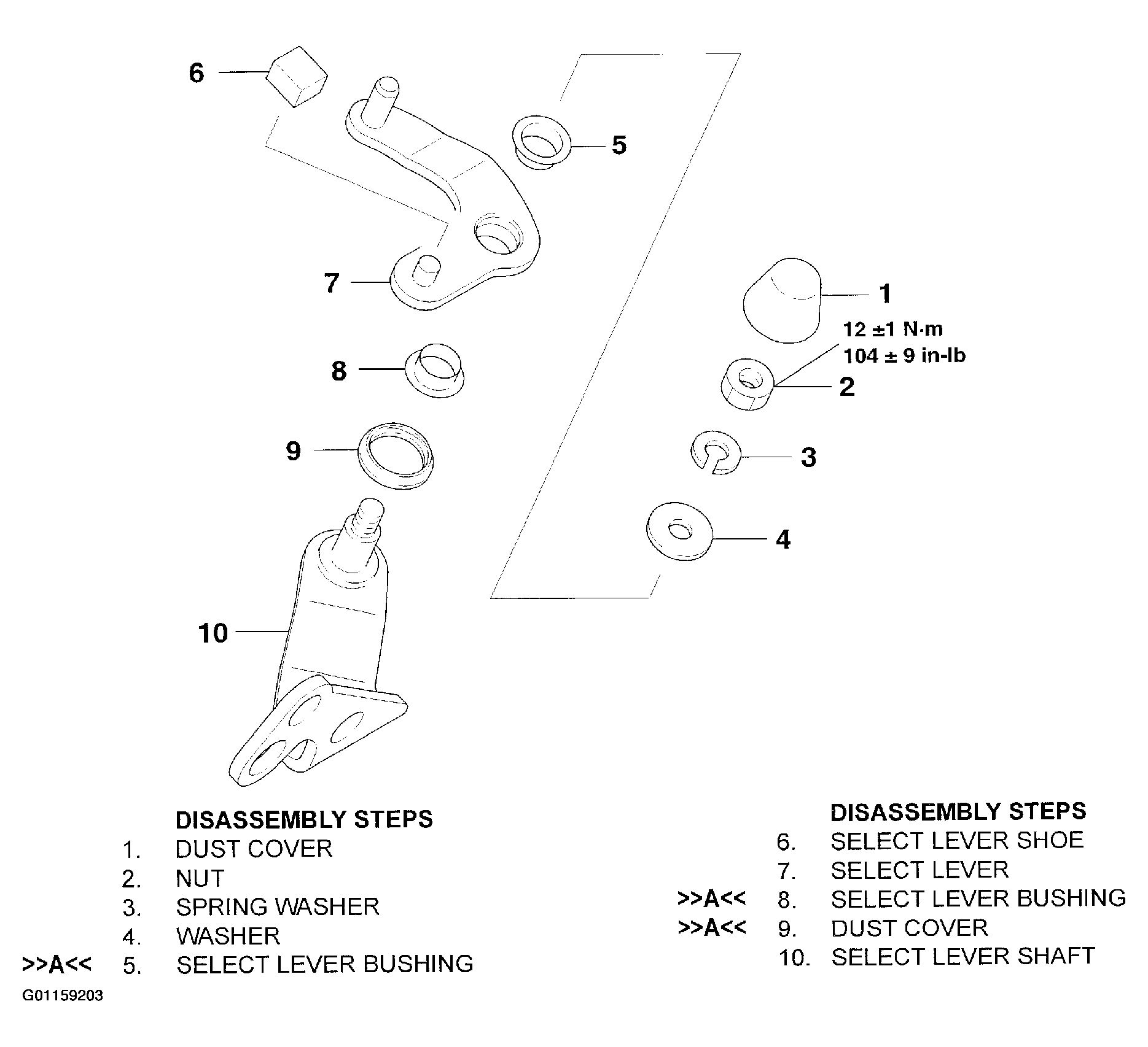 For select lever disassembly procedures, follow numbered steps in illustration. See Fig 1. For select lever assembly procedures, follow numbers steps in illustration in reverse order. Letters in illustration refer to service point to observe while assembling select lever. Letters with arrows pointing towards letter refer to service points to be observed while performing that step of the assembly procedure. See ASSEMBLY SERVICE POINT .