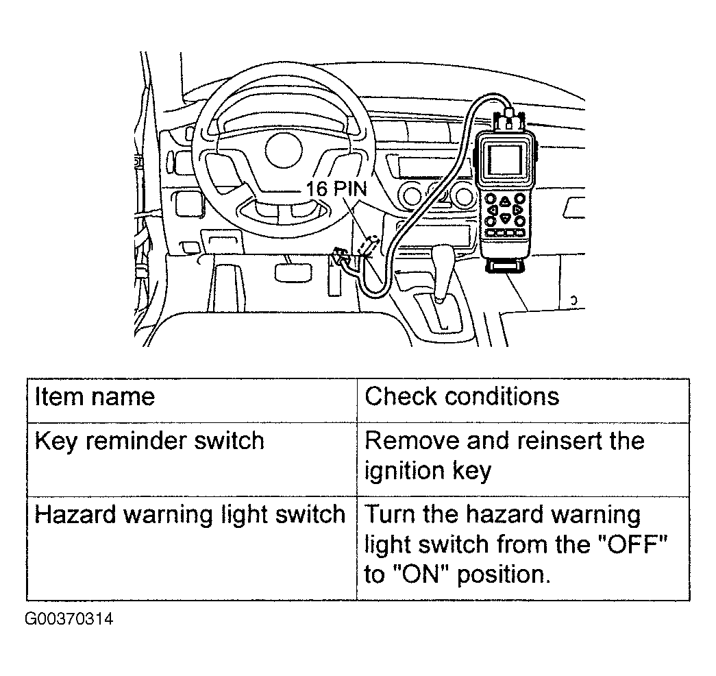 Scan tool MB991502 does not sound when the ignition key is removed and reinserted: See INSPECTION PROCEDURE M-1: ETACS-ECU DOES NOT RECEIVE A SIGNAL FROM THE KEY REMINDER SWITCH .Scan tool MB991502 does not sound when the hazard warning light switch is turned from "OFF" to "ON.": See INSPECTION PROCEDURE M-2: THE ETACS-ECU DOES NOT RECEIVE ANY SIGNAL FROM THE HAZARD WARNING LIGHT SWITCH .