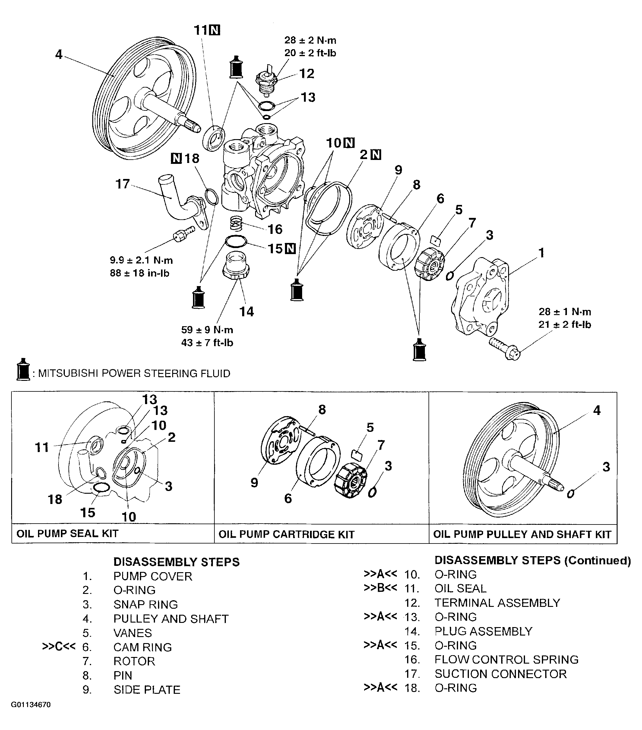 For power steering oil pump disassembly procedures, follow numbered steps in illustration. See Fig 1. For power steering oil pump assembly procedures, follow numbers steps in illustration in reverse order. Letters in illustration refer to service point to observe while disassembling and assembling power steering oil pump. Letters with arrows pointing towards letter refer to service points to be observed while performing that step of the assembly procedure. See ASSEMBLY SERVICE POINTS .