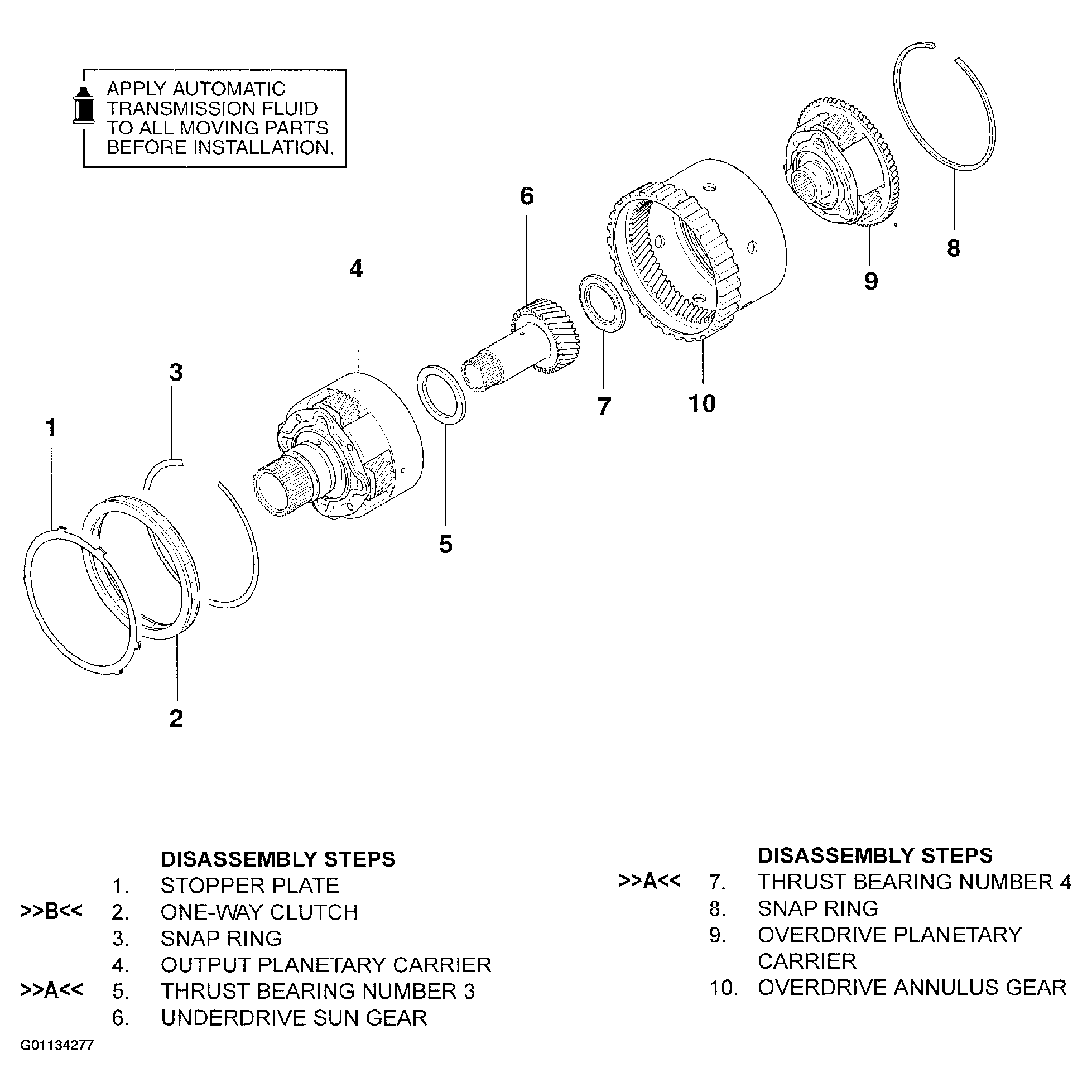 For planetary gear disassembly procedures, follow numbered steps in illustration. See Fig 1. For planetary gear assembly procedures, follow numbers steps in illustration in reverse order. Letters in illustration refer to service point to observe while disassembling and assembling planetary gear. Letters with arrows pointing towards letter refer to service points to be observed while performing that step of the assembly procedure. See ASSEMBLY SERVICE POINTS .