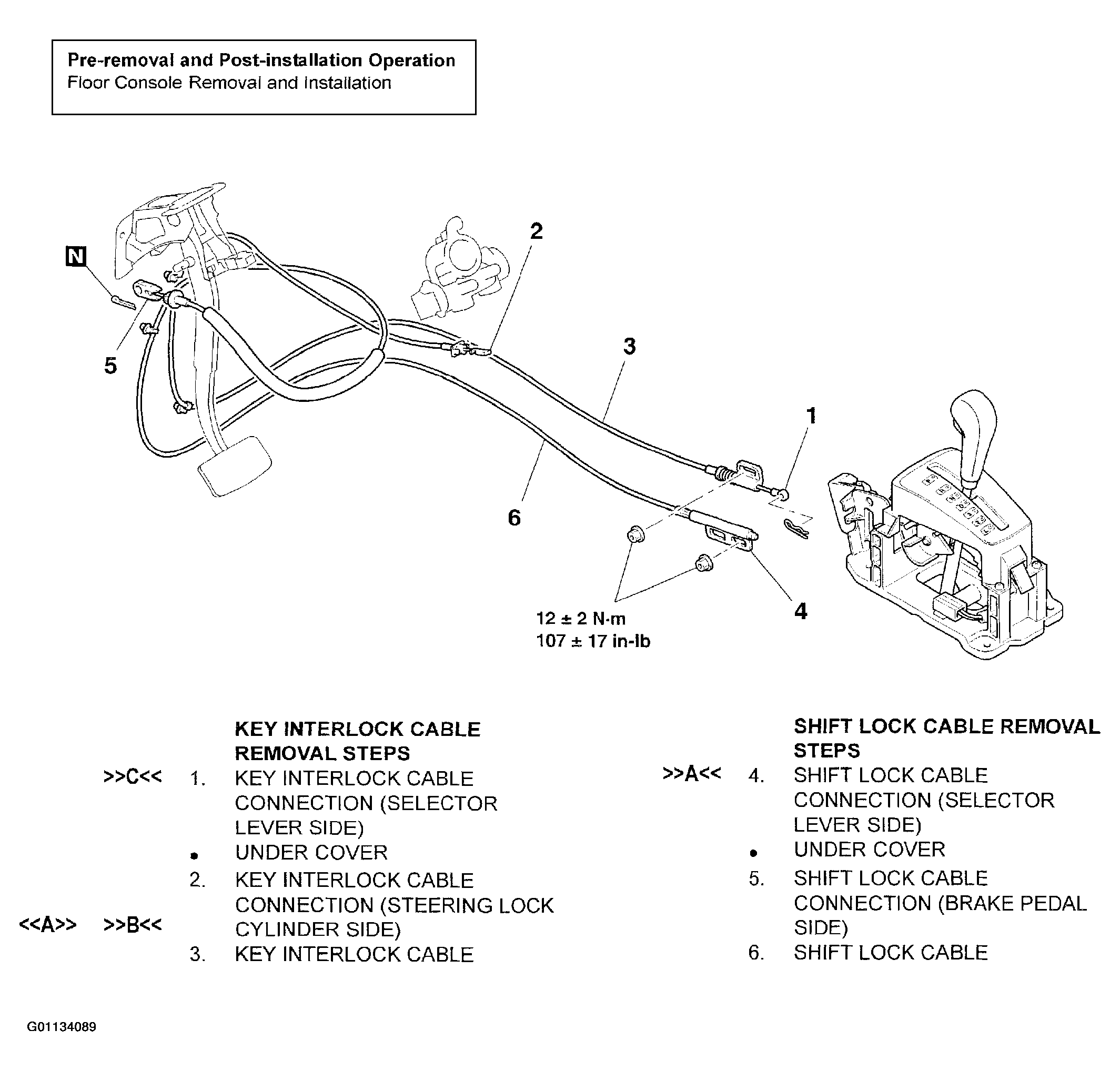 For automatic transaxle key interlock and shift lock mechanisms removal procedures, follow numbered steps in illustration. See Fig 1 . For automatic transaxle key interlock and shift lock mechanisms installation procedures, follow numbers steps in illustration in reverse order. Letters in illustration refer to service point to observe while removing and installing automatic transaxle key interlock and shift lock mechanisms. Letters with arrows pointing away from letter refer to service points to be observed while performing that step of the removal procedure. See REMOVAL SERVICE POINT . Letters with arrows pointing towards letter refer to service points to be observed while performing that step of the installation procedure. See INSTALLATION SERVICE POINTS .