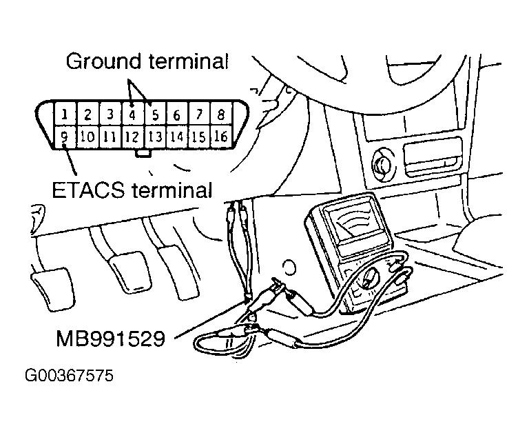 Use the special tool to connect a voltmeter between the ground terminal and the ETACS terminal of the data link connector. If the voltmeter indicator deflects once when each switch is operated (ON/OFF), the ETACS-ECU input signal for that switch circuit system is normal. See Fig 1 .