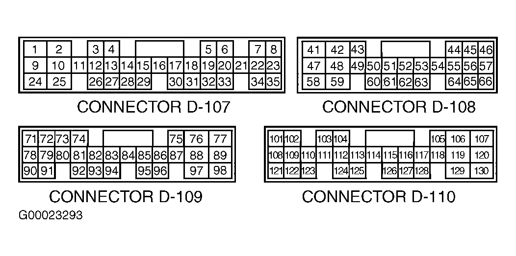 - Disconnect PCM connector D-108. See Figure. Check PCM connector D-108 for loose, damaged, or corroded terminals. If problem exists, repair or replace connector. Go to step 12. If problem does not exist, go to next step.