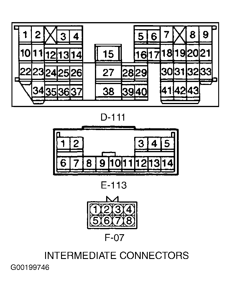 - Disconnect PCM connector D-108. See Figure. Check PCM connector D-108 for loose, damaged, or corroded terminals. Also check 8-pin intermediate connector F-07, 14-pin intermediate connector E-113 and 43-pin intermediate connector D-111 for damage and repair as necessary. See Figure. If 8-pin intermediate connector F-07, 14-pin intermediate connector E-113 and 43-pin intermediate connector D-111 are OK, repair or replace connector(s). Go to step 12. If problem does not exist, go to next step.