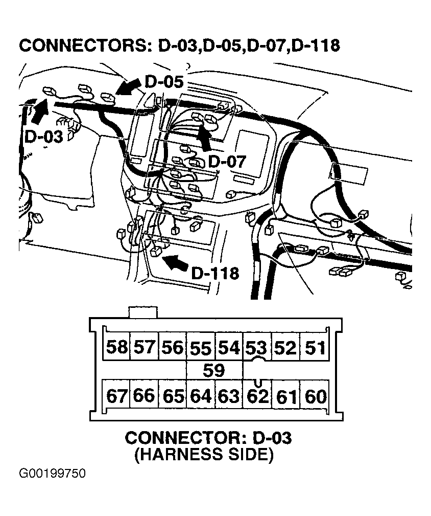 - Disconnect PCM connector D-108. See Figure. Check PCM connector D-108 for loose, damaged, or corroded terminals. If problem exists, repair or replace connector. Go to step 12. If problem does not exist, check intermediate 8-pin connector F-07, 14-pin connector E-113 and 43-pin connector D-111 for damage and repair as necessary. See Figure. If intermediate 8-pin connector F-07, 14-pin connector E-113 and 43-pin connector D-111 are OK, repair Green/Yellow wire between fuel gauge unit 3-pin connector terminal No. 1 and PCM connector D-108 terminal No. 60. Then go to step 12.