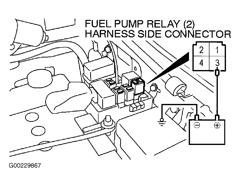 2. Remove the fuel pump relay (2). Connect terminal number 3 of the harness-side connector to the battery. See Fig 1. Check if the fuel pump operation sound can be heard at this time.