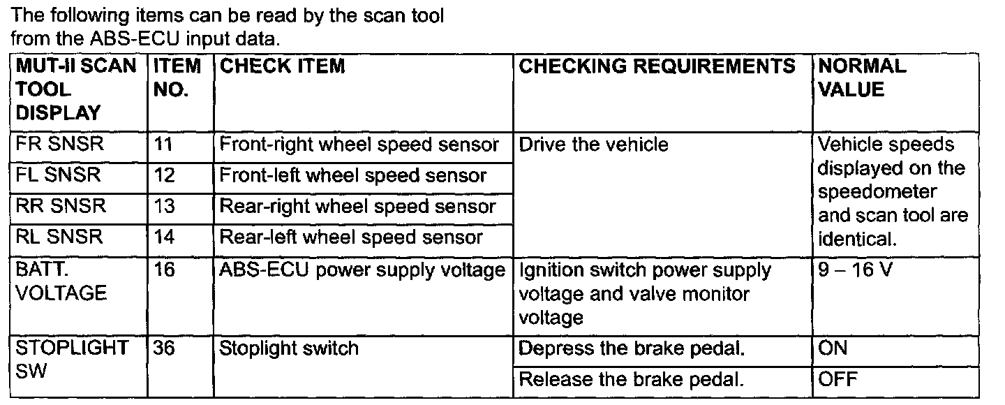 The following items can be read by the scan tool from the ABS-ECU input data.