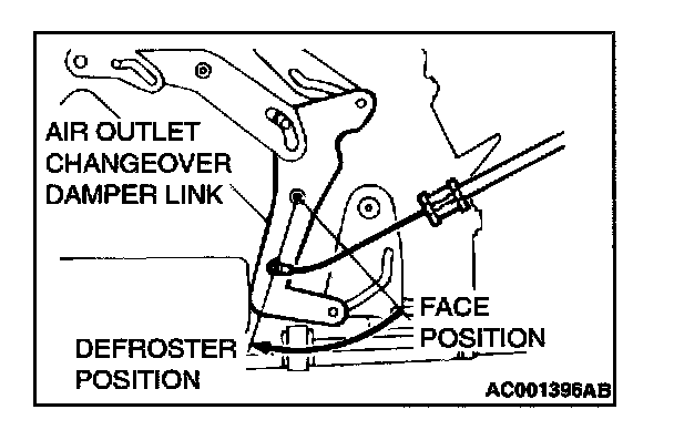 2. Set the air outlet changeover damper link of the heater/cooler unit to the defroster position as shown in the illustration, and then connect the cable to the link pin.