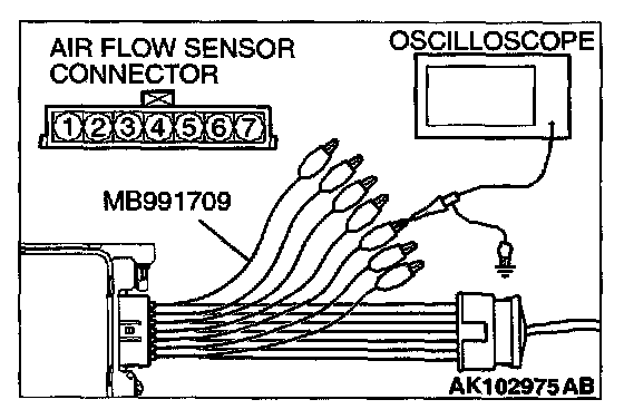 1. Disconnect the volume air flow sensor connector, and connect the test harness special tool (MB991709) in between. (All terminals should be connected.)